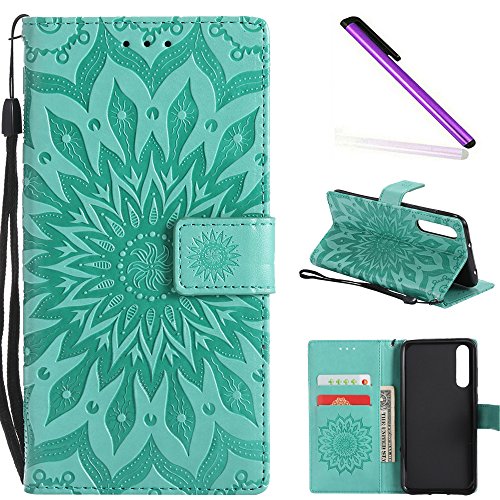 COTDINFOR Huawei P20 PRO Custodia Premium PU Leather Mandala Fiore Elegante Wallet Custodia a Rilievo Custodia Folio Flip Cover Case con Kickstand Card per Huawei P20 PRO Green Sunflower KT.