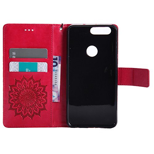 COTDINFOR Huawei Honor 8 Custodia Premium PU Leather Mandala Fiore Elegante Wallet Custodia a Rilievo Custodia Folio Flip Cover Case con Kickstand Card per Huawei Honor 8 Red Sunflower KT.