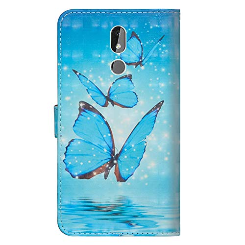 COTDINFOR pour Nokia 3.2 Custodia Cover TPU 3D Effect Painted PU in Pelle con Wallet Card Holder Magnetico Ultrasottile Antiurto Flip Custodia per Nokia 3.2 Three Blue Butterflies YX