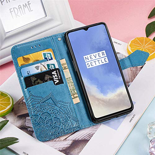 COTDINFOR per OnePlus 7T Custodia Slim Chiusura Magnetica Retro PU Folio Filp Antiurto Portafoglio a con Slot Schede Custodia per OnePlus 7T / 1+7T Half Mandala Blue SD