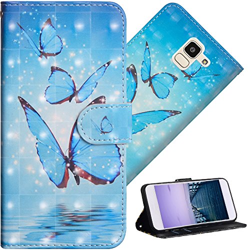 COTDINFOR pour Samsung Galaxy J6 2018 Custodia Cover TPU 3D Effect Painted PU in Pelle con Wallet Card Holder Flip Custodia per Samsung Galaxy J6 2018 / (EU Version) Three Blue Butterflies YX.