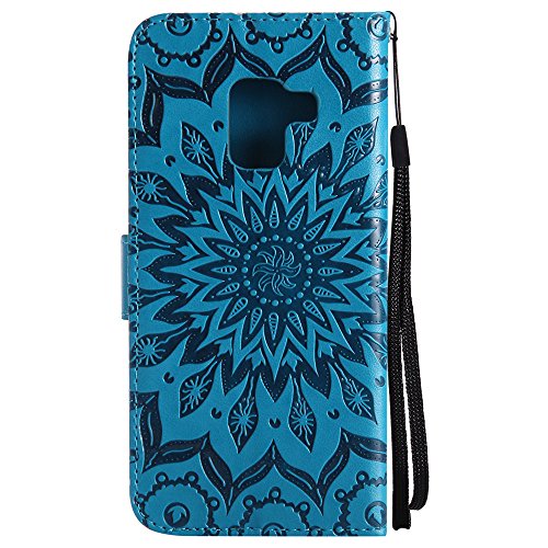 COTDINFOR Samsung Galaxy A8 2018 Custodia Premium PU Leather Mandala Fiore Wallet Custodia a Rilievo Custodia Flip Case con Kickstand Card per Samsung Galaxy A8 2018 Blue Sunflower KT.