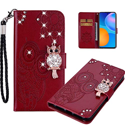 COTDINFORCA Case for Huawei P30 Lite Custodia Crystal Bling PU Leather Retro Shine Diamond Owl Shockproof Card Slot Magnetic Lock Phone Cover per Huawei P30 Lite Deep Red Owl YK.