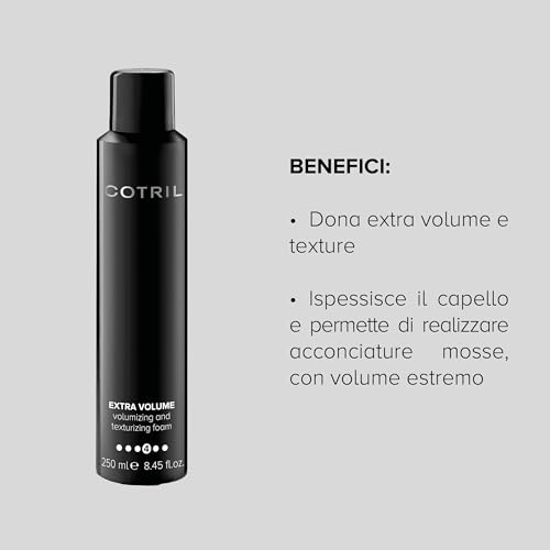 TEXTURE E DEFINIZIONE DEFINITE: Con la sua formula ricca e cremosa, Cotril Extra Volume Mousse permette di creare texture e movimento, definendo i capelli e mantenendo l'elasticità naturale per look dinamici e pieni di vita.