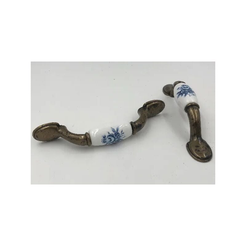 Maniglia per mobile in ottone antichizzato con inserto in porcellana bianca con disegno fiori blu. Interasse di foratura mm.74