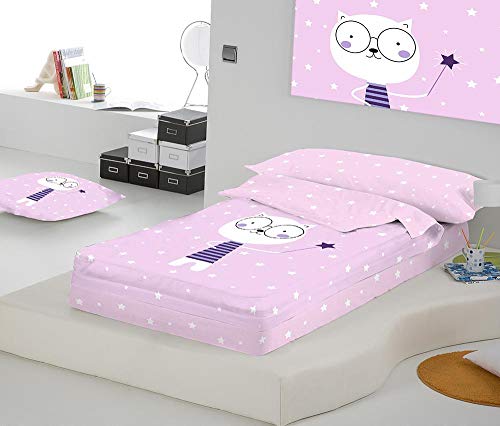 Set di 4 pezzi: copripiumino, lenzuolo con angoli, federa e imbottitura. Copripiumino unito al lenzuolo sotto tramite cerniera. Dotato di un soffietto per una maggiore mobilità all'interno del copripiumino.
