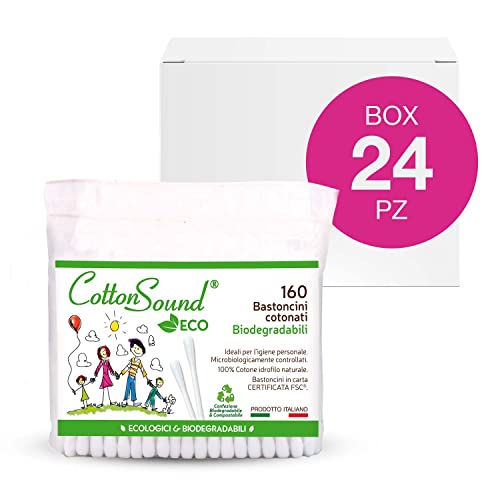 COTTON SOUND ECO Bastoncini Cotonati Busta 24 confezioni x 160 Pezzi, Bastoncini Cotonati Ecologici e Biodegradabili, 100% Puro Cotone Idrofilo, Busta Compostabile, Made in Italy