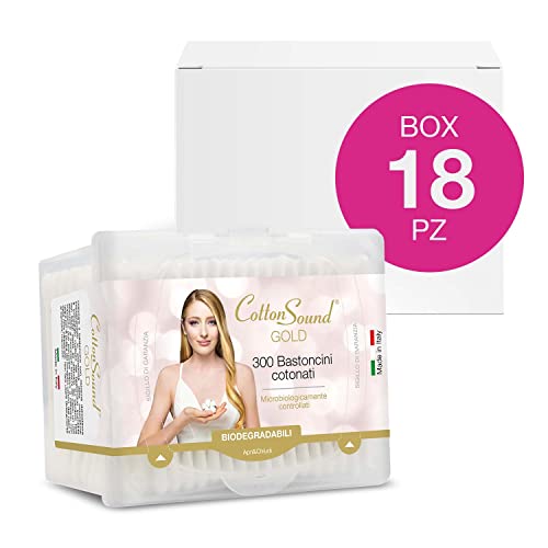 COTTON SOUND GOLD Bastoncini Cotonati 18 confezioni x 300 Pezzi, Scatola Apri e Chiudi, Bastoncini Cotonati in Carta Biodegradabile, 100% Puro Cotone Idrofilo, Ideali Pelli Sensibili, Made in Italy