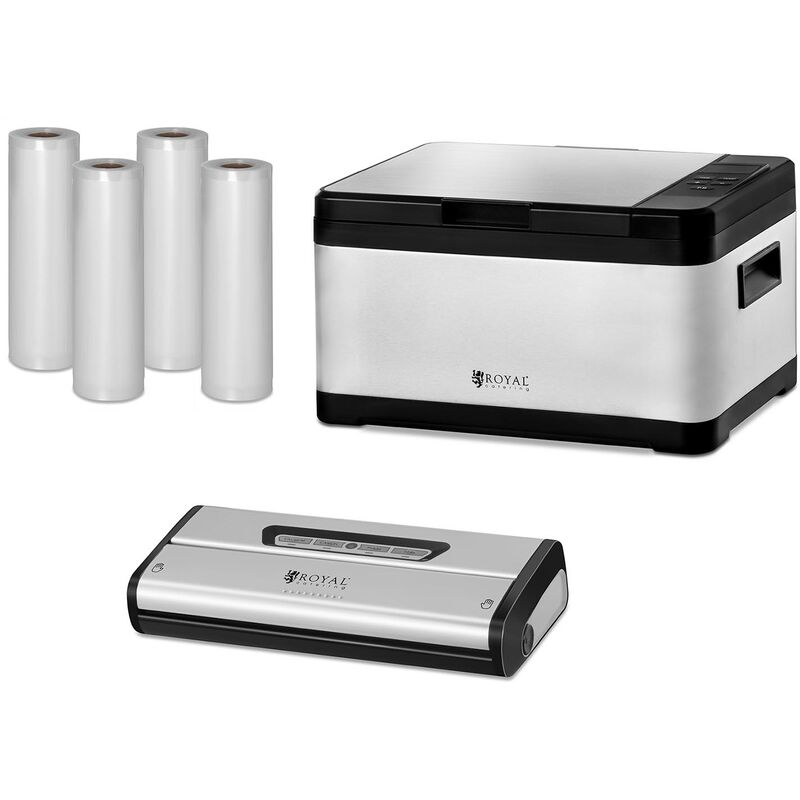 Set per cottura sottovuoto - macchina sottovuoto e rotoli sacchetti per sottovuoto inclusi - 8 L Desideri cuocere gli alimenti a basse temperature in sacchetti sottovuoto per esaltarne le proprietà benefiche e nutritive? Non aspettare altro tempo! Acquista oggi stesso un set per cottura sottovuoto RCSV-SET1 del marchio Royal Catering! Il set comprende una macchina per cottura sottovuoto, una macchina sottovuoto per alimenti e quattro rotoli di sacchetti per sottovuoto. Il set che ti offriamo è particolarmente adatto per l'impiego professionale in alberghi, ristoranti o servizi di catering ma può essere utilizzato anche a casa.