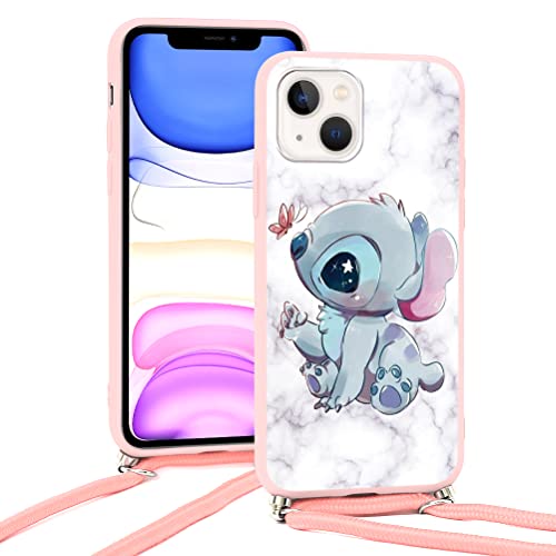 Cover per Apple iPhone 14 Pro Max 6,7", Carino Stitch Cartone Custodia con Stylish Pratico Cordino Morbido Silicone Case con Cinturino Regolabile Collana Rosa TPU Cover per iPhone 14 Pro Max, 01