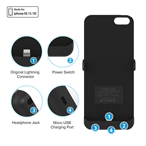 Cover Batteria iPhone SE, SAVFY 4200mAh Custodia Cover Protettiva con Batteria Esterna integrata per iPhone 5/5s/se Power Bank Backup Battery Charger Case (Nero)