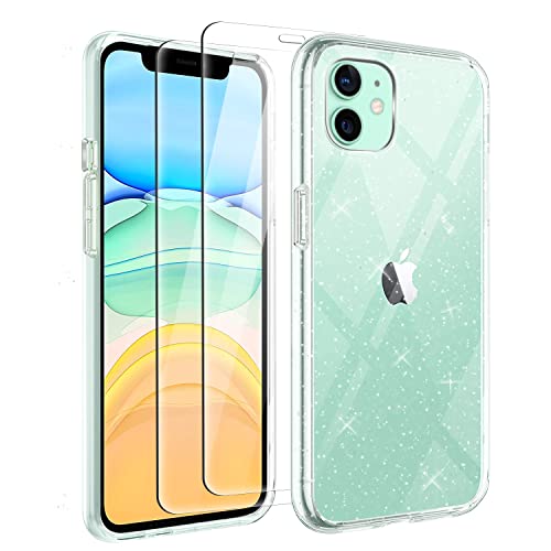 Cover Compatibile con iPhone 11 Custodia Glitter, 2 Pezzi Pellicola Protettiva in Vetro Temperato, Brillantini Custodia Morbido TPU Protezione Trasparente Antiurto Case