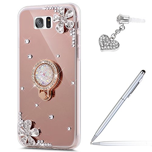Cover Galaxy S7,Custodia Galaxy S7,ikasus [supporto anello] Fiori Strass diamante glitter Bling Placcatura Mirror specchio Custodia Morbida TPU Silicone Gel Custodia Case Cover per Galaxy S7,Oro rosa
