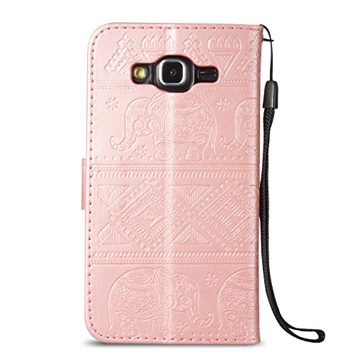 Cover Galaxy J5 2015, ISAKEN per Custodia Samsung Galaxy J5, Galaxy J5 Flip Cover con Strap, Elegante Sbalzato Embossed Bookstyle PU Pelle Case Protettiva Flip Portafoglio Cover Protezione Waller Caso con Supporto di Stand / Carte Slot / Chiusura - Elefante: rose gold