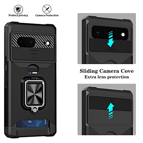 Jusy Cover per Google Pixel 6A con 2 Pezzi Vetro Temperato, Protezione Fotocamera Slot Carte Custodia Antiurto Grado Militare 360° Anello Supporto Nero