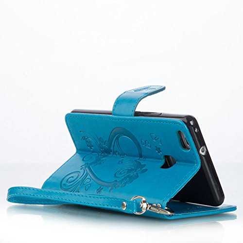 Cover per Huawei P9 Lite Custodia in Pelle,SKYXD Elegante Portafoglio Supporto Libro Case Custodie 360 Gradi impermeabile Full Body Antiurto Protettiva Custodia Cellulare per Huawei P9 Lite con Glitter Spina Della Polvere e Stilo (Azzurro Fiore Farfalla)