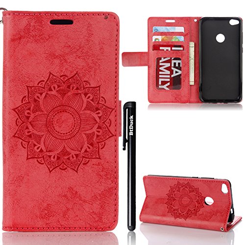 Flip Cover per Huawei P8 Lite 2017 Nuova Versione,(Non per Huawei P8 Lite 2016) Custodia per Huawei P8 Lite 2017 Pelle Fiori,BtDuck Ultra Sottile PU Pelle Retro modello di fiori Mandala Shell protettivi Bumper Wallet Caso Custodia in Pelle per Huawei P8 Lite 2017 Chiusura Magnetica ID Carte di Credito Slot Porta Carte Borsa Protettiva Flip Cases Ecopelle Pelle con Lanyard Strap Libro Portafoglio Supporto Stand insiemi di telefono Silicone Interno Case Smart Cover + 1x Nero Stylus Penna - Rosso