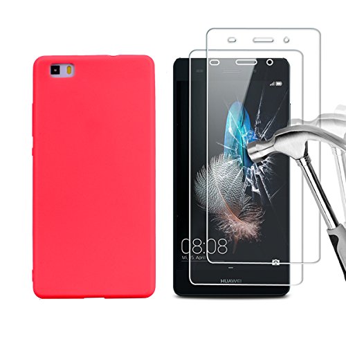Cover Huawei P8 Lite 2015 2016 Vetro Temperato, E-Unicorn Custodia Huawei P8 Lite 2015 2016 Cover Silicone Ultra Sottile Rosso Morbida Copertura TPU Gomma Colorate Slim Bumper Case Protettiva Posteriore + 2 Pack Pellicola Vetro Temperato Huawei P8 Lite 2015 2016 HD Film 9H 3D Anti-impronte