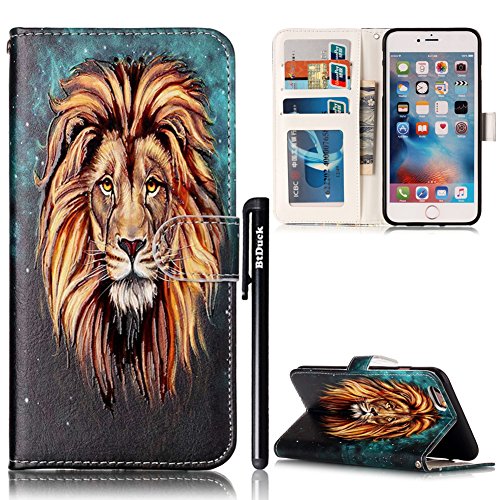 Cover per iPhone 6/iPhone 6S 4.7 Flip Libro,BtDuck Ultra Slim PU Pelle Borsa e Portafoglio Tasca Progettato Specializzato Creativo Sollievo Colorato Modello Relief Vento Nazionale Libro Stand Case Cover Morbido Silicone Back Case Bumper Cover Custodia in Premium Portafoglio Magnetica Disegno Flip Cover per iPhone 6/iPhone 6S 4.7 Telefono Morbida Anti-Theft Wallet Case per Donna Ragazza Ragazzo Uomo con Bookstyle Protezione Silicio Flip Case + 1x Nero Stylus Penna - Leone