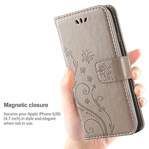 Cover iPhone 6, iDoer Retro Farfalla Fiore Modello Stampata Design Con Cinturino da Polso Custodia in pelle Protettiva Cuoio Portafoglio Flip Cover per Apple iPhone 6/6S Grigio