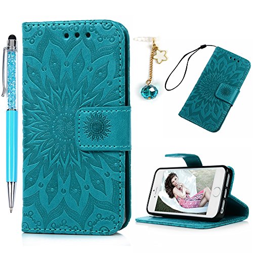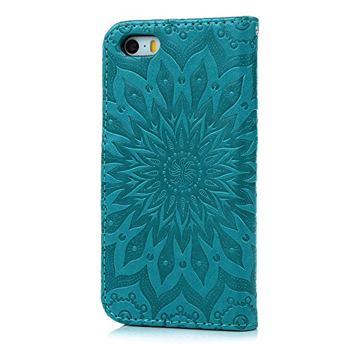 Cover iPhone SE, Cover iPhone 5 Pelle Stampata Folio Wallet Custodia - Morbido Case Libro Premium PU Leather Gel TPU Interno, Magnetico Flip Protettiva Portafoglio, ID Slot per Scheda, Chiusura Magnetica - girasole con Penna Capacitiva + Spina Della Polvere, Blu