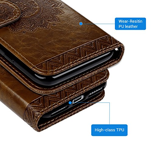 Cover iPhone 7, Premium PU e Silicone TPU Case [2 in 1, Separato] - Flip Custodia Morbido Leather,Goffratura Totem Fiore, Chiusura Magnetica, Supporto Stand, Portafoglio Porta Carte e Protettiva - Marrone