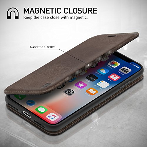 CONVENIENZA CON MOLTEPLICI FUNZIONI: Con alloggiamenti per la tua Carta d'Identità, i contanti, le carte di credito, non chiederti più dove mettere il portafoglio. La custodia a flip in vero cuoio premium è un portafoglio sottile e comodo per il tuo iPhone X che ti permette di riporre le cose più importanti tutte in un unico posto