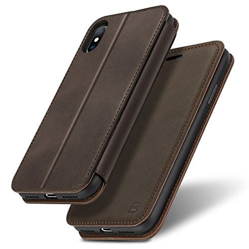 BEZ® Cover in Pelle per iPhone X XS, Custodia Compatibile per iPhone X XS,Flip Realizzata a Mano in Sottile Vera Pelle di Lusso, Cover Classica a Libro con Supporto, Tasca Porta Carte - Chocolate