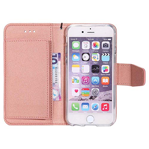 Cover a portafoglio per iPhone 8/iPhone 8 Plus, con pellicola protettiva per schermo in vetro temperato inclusa, in pelle sintetica con scomparto integrato per carte di credito (massimo 5 carte), colore rosa goffrato con farfalle e chiusura con aletta magnetica rimovibile, in poliuretano termoplastico trasparente antiurto rosa e oro Rose Gold iPhone 8