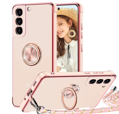 Cover per Samsung Galaxy S22 con Cordino e 360° Anello Supporto, Custodia Sottile Morbido Silicone TPU Antiurto Dorata Placcatura Protettiva Bumper Case con Regolabile Collana Tracolla, Rosa