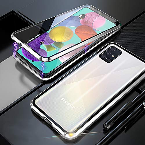 Cover Samsung Galaxy A51,Magnetica Custodia[Cornice Metallica][Doppio Vetro Temperato] Adsorbimento Magnetico 360 Gradi Full Body Trasparente Vetro Temperato,per Samsung Galaxy A51 Cassa - Argento