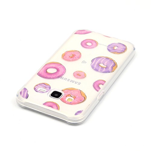 Cover per Samsung Galaxy J5 (2015 Model),Funyye Morbida Sottile TPU Gel Silicone Custodia Originale Antiscivolo Elegante Protettiva Caso Chiaro Copertura Slim Thin Skin Shell + Pellicola Protettiva per Samsung Galaxy J5 2015 J500FN Trasparente Soft Bumper - Ciambelle Rosa e Viola
