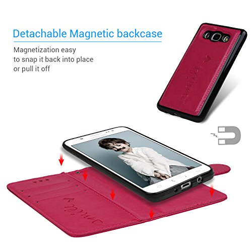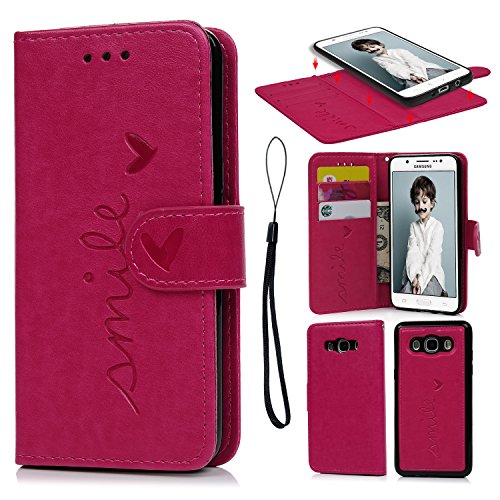 Cover per Samsung Galaxy J5 2016 Pelle Premium PU e Silicone TPU Case [2 in 1, Separato] - Flip Custodia Morbido Leather, Goffratura Amare, Chiusura Magnetica, Supporto Stand, Portafoglio Porta Carte e Protettiva - Colore di Rosa Rossa