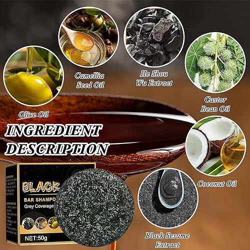【Ingredienti naturali】Hair darkening shampoo bar differenza delle comuni tinture per capelli, questo sapone shampoo è realizzato con ingredienti completamente naturali.Soap cover bar shampoo Non contiene sostanze chimiche per colorare i capelli, protegge i capelli e il cuoio capelluto dalle irritazioni.Soap cover hair men bar shampoo Arricchito con he shou wu naturale per mantenere i capelli scuri e belli. Contiene foglie di basetta per rimuovere umidità e calore e liberarsi della for