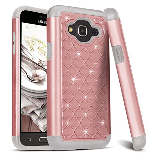 Cover tempestata di strass luccicanti, a due strati, resistente e rinforzata, si adatta perfettamente a Samsung Galaxy J3 (2015) e Galaxy J3 (2016).