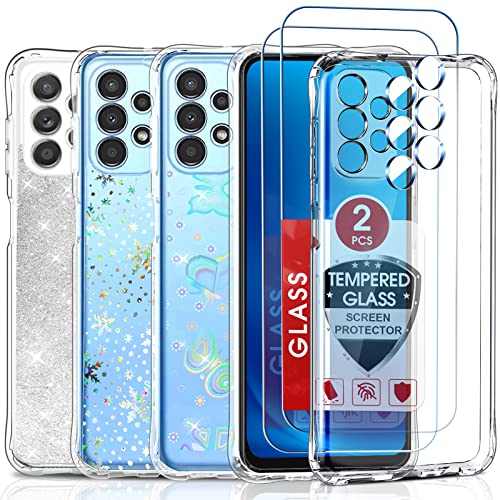 LeYi Cover Trasparente per Samsung Galaxy A13 4G con 2 Vetro Temperato+2 Pellicola Fotocamera,Custodia con 3 Adesivi Glitter Brillantini,Silicone TPU Antiurto Protezione Morbido Sottile Custodie