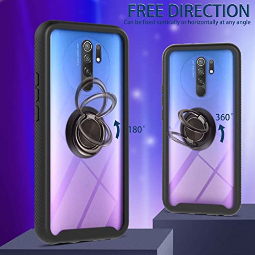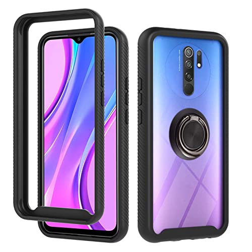 Cover per Xiaomi Redmi 9, con Magnetica Anello Ring Supporto, Custodia 2in1 Dual Layer Ibrida Morbido 360° Full Body Protettiva Bumper e Armor Antiurto Back, Negro