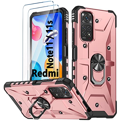 Cover per Xiaomi Redmi Note 11 / 11S Con 2 Pack Vetro Temperato [360° Rotante Anello Supporto Magnetica] Custodia Silicone Militare Antiurto Anti Graffi Bumper, Per Redmi Note 11S Case - Oro Rosa