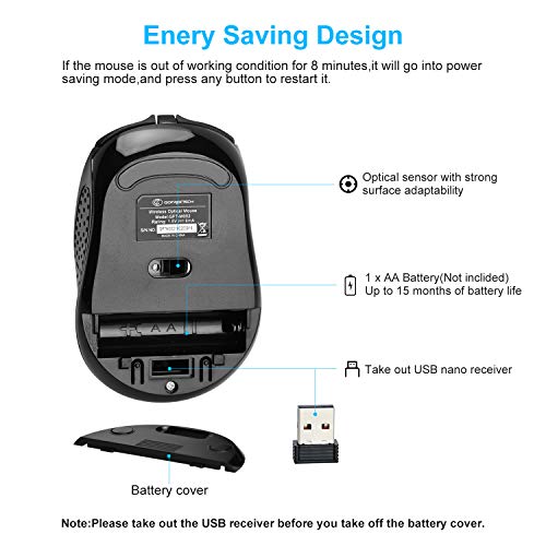 Design a risparmio energetico: progettato con modalità di risparmio energetico e interruttore di alimentazione, se il mouse è in condizioni di lavoro per 8 minuti, entrerà in modalità di risparmio energetico, premere qualsiasi pulsante per riavviarlo. È alimentato da solo 1 batteria AA da 1,5 V (non inclusa), fino a 15 mesi di durata della batteria con una singola batteria AA, si può quasi dimenticare di cambiare le batterie.