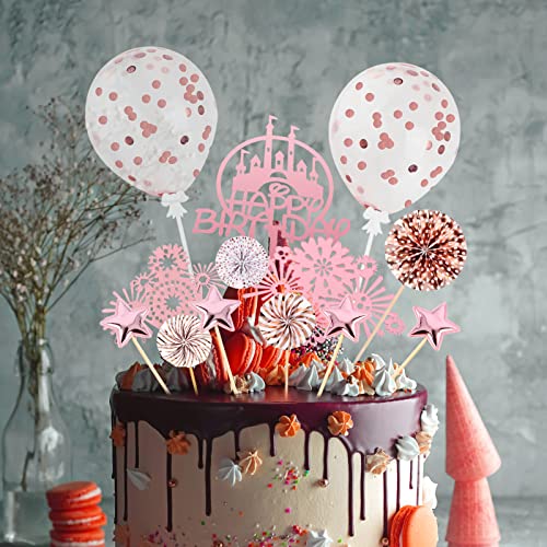 Cozlly 15 Pezzi Compleanno Torta Topper, Decorazione Torta, Stelle Cupcake Toppers, Glitter Torta Topper, Palloncino Torta Topper, Cake Topper Kit per Ragazzo Ragazze Feste di Compleanno (Rosa)