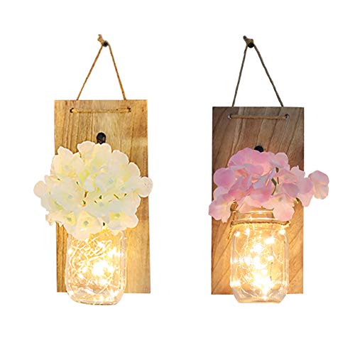 ✿ Contenuto della confezione: kit di lampade da parete rustiche con 2 tavole di legno dotate di ganci anticati, 2 barattoli, 2 strisce di rame bianco caldo (batterie escluse), 2 ortensie artificiali (2 bianche o 2 viola). Queste lampade da parete sono un'ottima scelta per arredare le stanze.
