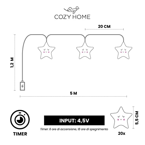 CozyHome, catena luminosa a forma di stella, per cameretta dei bambini, 20 LED, 5 m, luce bianca calda, funzionamento a batteria