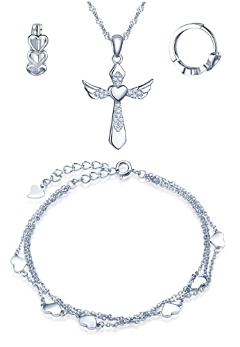 CPSLOVE Collane Braccialetto e Orecchini da donna, Parure di gioielli in argento 925, Collana Ciondolo Croce, Catena da 45cm, Bracciale cuore a catena a tre strati, Orecchini Cerchio a cuore, Argento