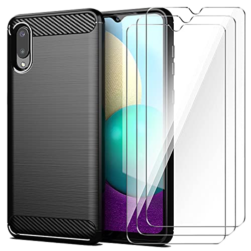 CQiuLi Cover per Samsung Galaxy A02 + 3 Pezzi Vetro Temperato, Flessibile Soft TPU Spazzolato Custodia in TPU Morbido Fibra di Carbonio, Cover Protezione Anti Scivolo/Antiurto - Nero