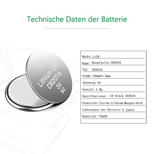 Sicuro e affidabile: LiCB dal 2006, specializzato in batteria 16 anni. Cella a bottone CR2016 testata secondo rigorosi standard di controllo della qualità. Certificato CE e RoHS. Batterie di ottima qualità che garantiscono una lunga durata.
