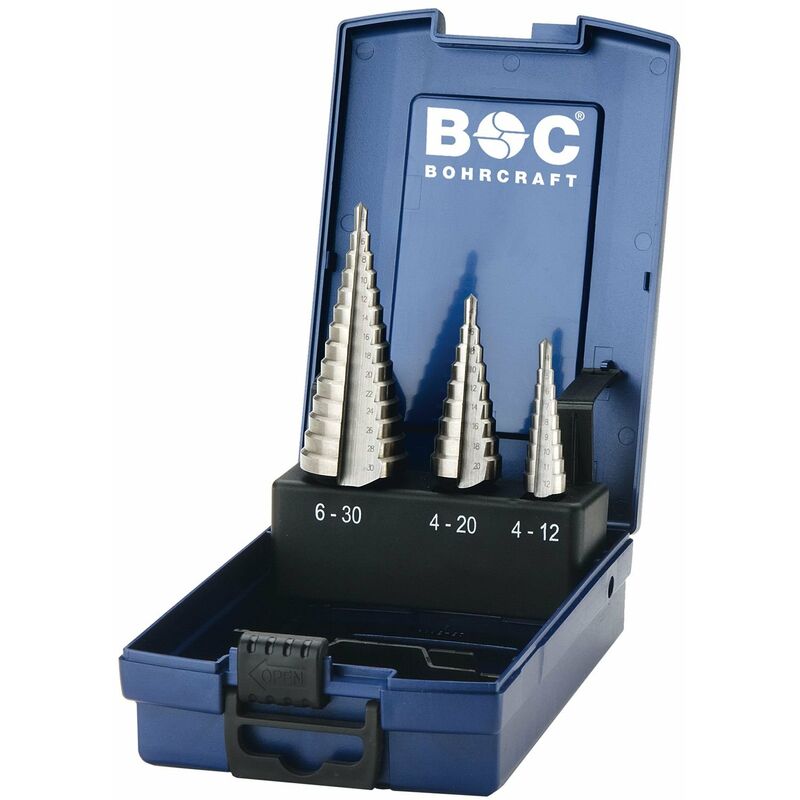 Heller - Set di punte per trapano a gradini, misura 1-3 HSSG 2, ø 4,0-30,0 mm Per praticare fori più grandi in materiali a parete sottile e per praticare fori esistenti in lamiera di acciaio e acciaio inossidabile fino a 2 mm di spessore, nonché metalli non ferrosi fino a 4 mm di spessore. In scatola di plastica. Attacco: codolo cilindrico Diametro punta da 4 a 30 mm. Contenuto: taglia 1 (4,0-12,0), taglia 2 (4,0-20,0), taglia 3 (4,0-30,0). Materiale: HSSG Set da 3 pezzi.