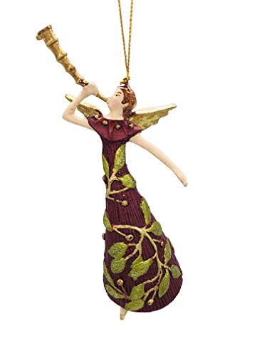 Materiale: resina, colore rosso scuro, ali e fanfara, decorazioni, verde chiaro, leggero effetto metallizzato, nastro dorato per appenderla