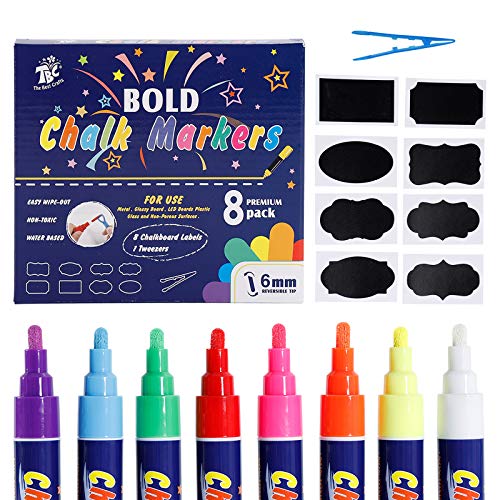 TBC The Best Crafts - Pennarello a gesso liquido, 8 colori fluorescenti, cancellabile a secco, punta reversibile da 6 mm, per lavagna, lavagna, vetro