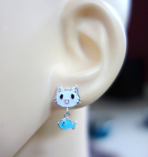Katy Craig - Piccoli orecchini a perno in argento Sterling a forma di gattino bianco con pesciolino, 1,7 x 1,0 cm, confezione da 2, forniti in confezione regalo