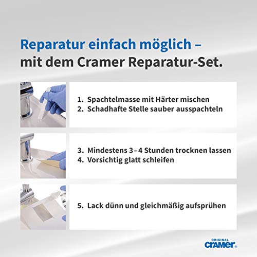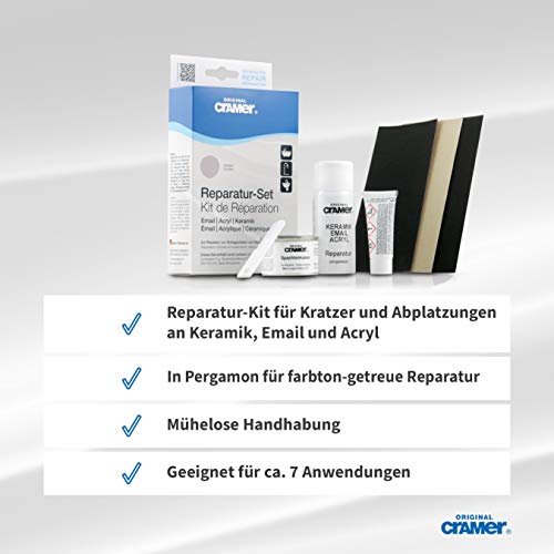Cramer Kit di riparazione Ceramica, Email & Acrilico Pergamon CRA16200DE per scheggiature e graffi, Set composto da 2 componenti, indurente, vernice di riparazione, spatola, abrasivo 66107 2